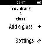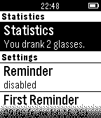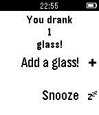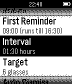 Example: With a First Time of 9:00, Interval of 1:30 and Target of 6 glasses the reminders come at 9:00, 10:30, 12:00, 13:30, 15:00 and 16:30. If you log 4 glasses at 10:00 the next reminder will be at 15:00 (for the 5th glass).